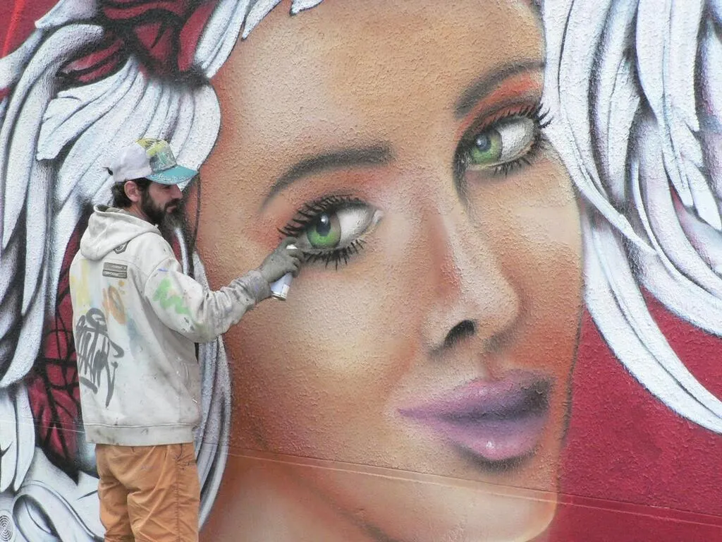 Le graffeur Atomik met les dernières touches à sa fresque monumentale commencée lors des Pictoires, début mai 2023. © Ouest-France