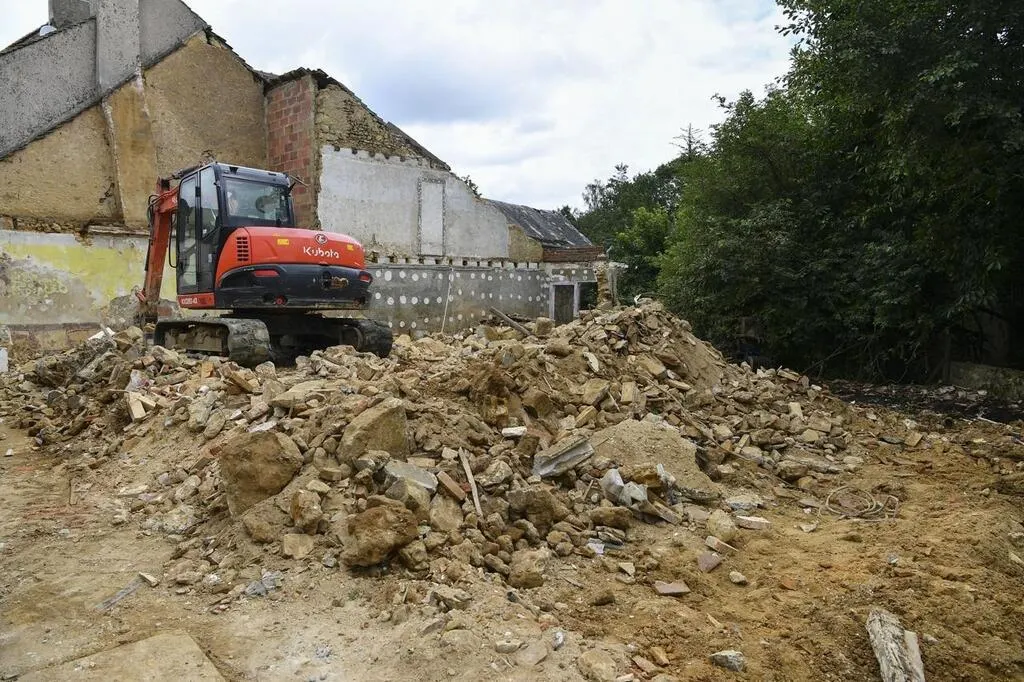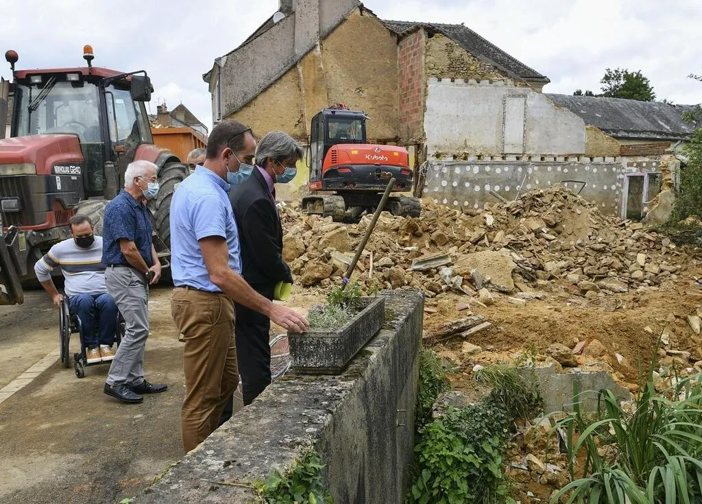 Souligné-sous-Ballon, mercredi 28 juillet 2021. Le sous-préfet est venu constater l’avancée du chantier. Il a salué « un modèle de résilience. » © Photo Le Maine Libre-Yvon LOUE