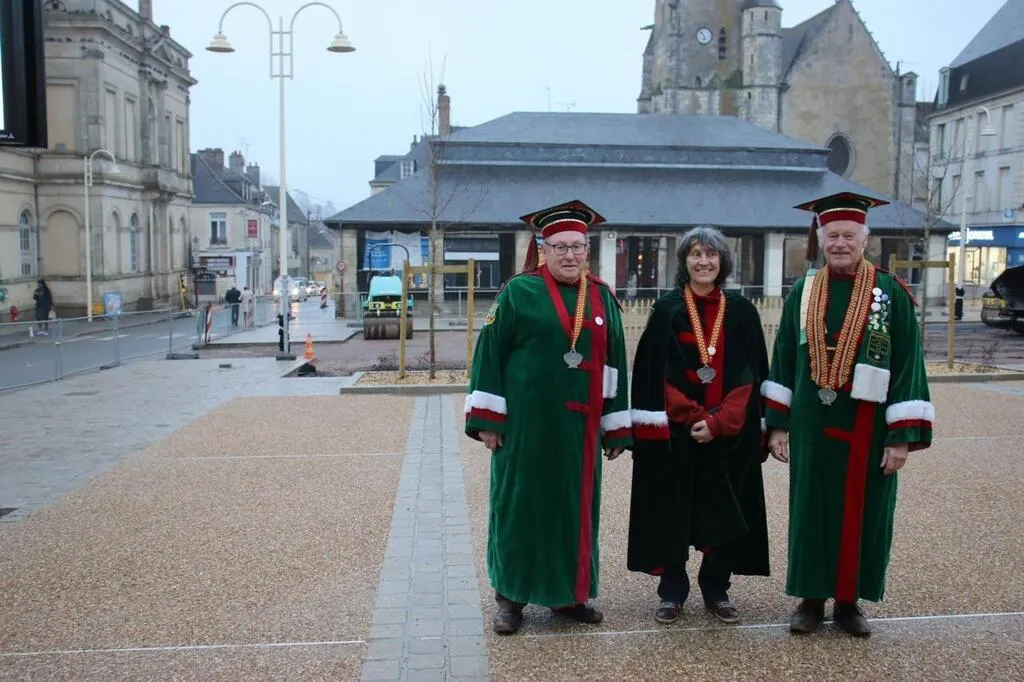 De gauche à droite : Michel Julien, Véronique Lesage, Jean-Michel Étienne de la Confrérie des chevaliers des rillettes sarthoises ont proclamé, mercredi 22 février 2023, le palmarès du 55e concours des rillettes sarthoises. © Ouest-France