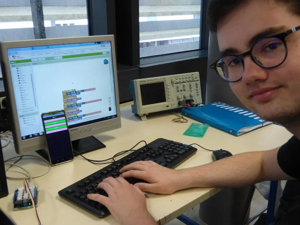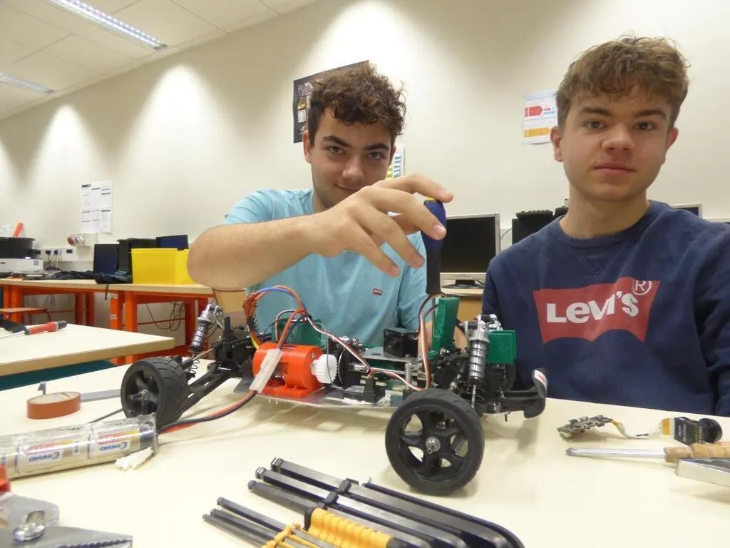 Derniers ajustements pour le bolide de Gaspard et Hugo, élèves de la classe de première STI2D, au lycée Raphaël-Élizé. © Ouest-France