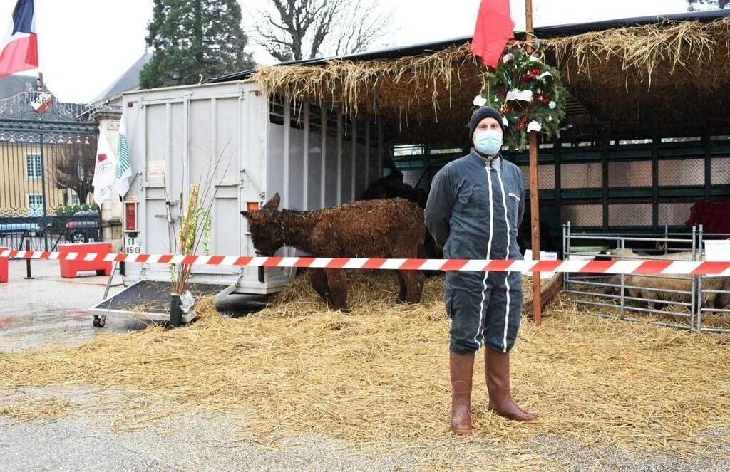 La section viande bovine de la fédération départementale des syndicats d’exploitants agricoles a installé devant la préfecture, au Mans, mardi 22 décembre 2020, une crèche vivante. Les éleveurs veulent interpeller les consommateurs de leurs conditions de travail et leur situation financière.