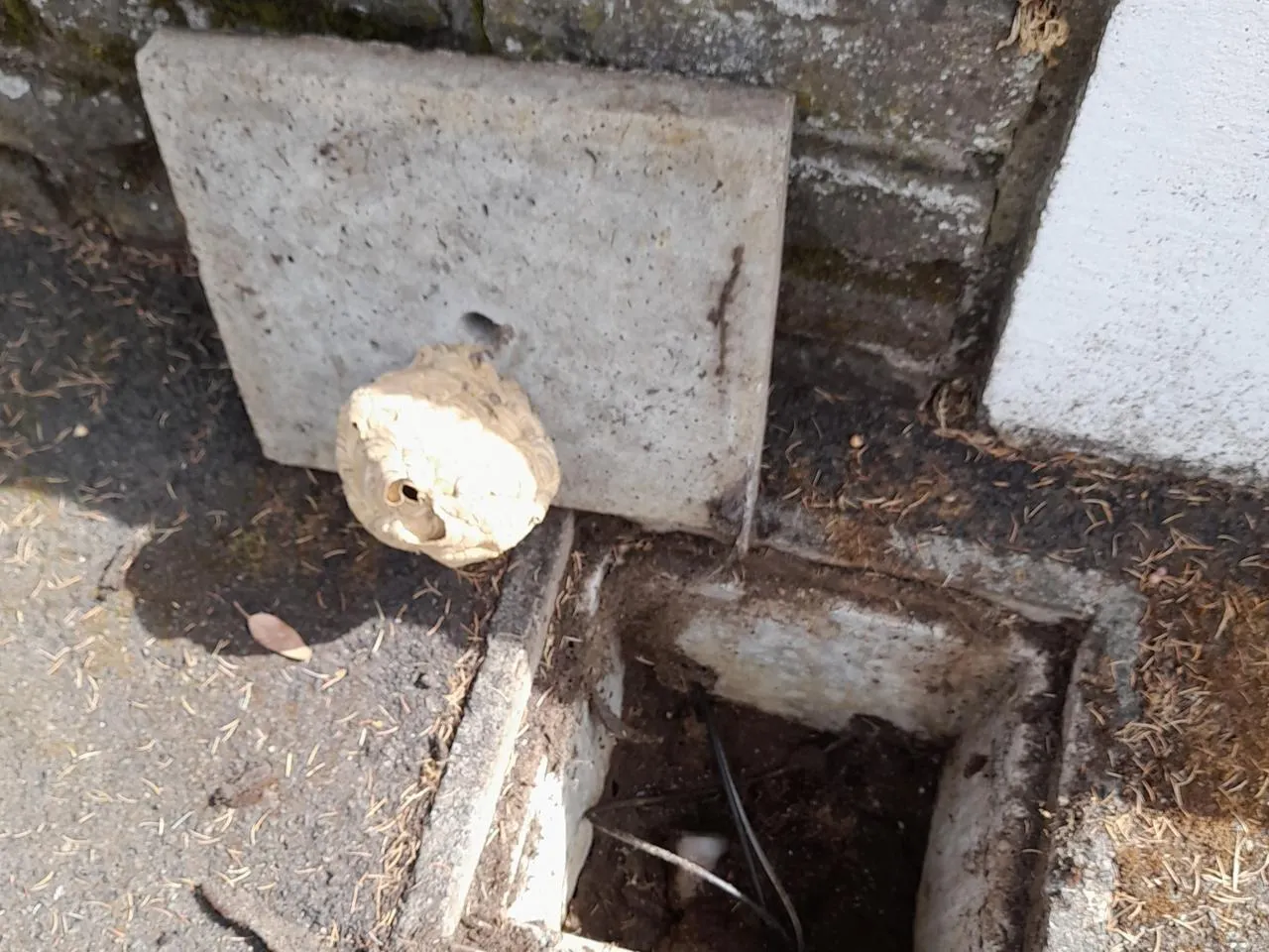 Un habitant de Saint-Pavace, près du Mans (Sarthe), a été hospitalisé, jeudi, après une réaction allergique due à une piqûre de frelon asiatique venant de ce petit nid installé dans un regard sous le trottoir devant chez lui. © Frelon solution