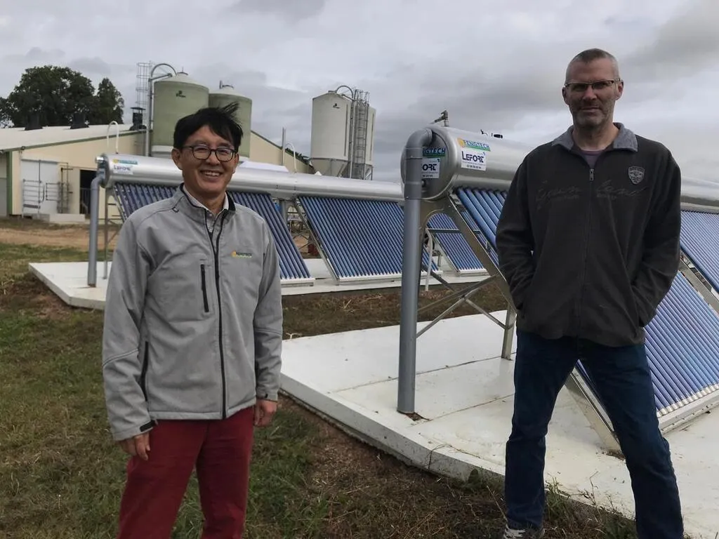 Liqun Feng, l’entrepreneur, a conçu la centrale solaire thermique qui permet à Frédéric Vaucelle, l’éleveur, de préparer le lait en poudre pour ses veaux, dans le bâtiment situé à l’arrière plan. © Ouest-France