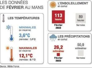 Au Mans, ville-centre du département, les températures minimales (souvent atteintes en fin de nuit) ont été de 3,6 °C en moyenne, contre 1,8 °C pour la normale en février. La différence est encore plus grande pour les températures maximales : 12,1 °C au lieu de 9,1 °C, soit trois degrés de plus que la normale.