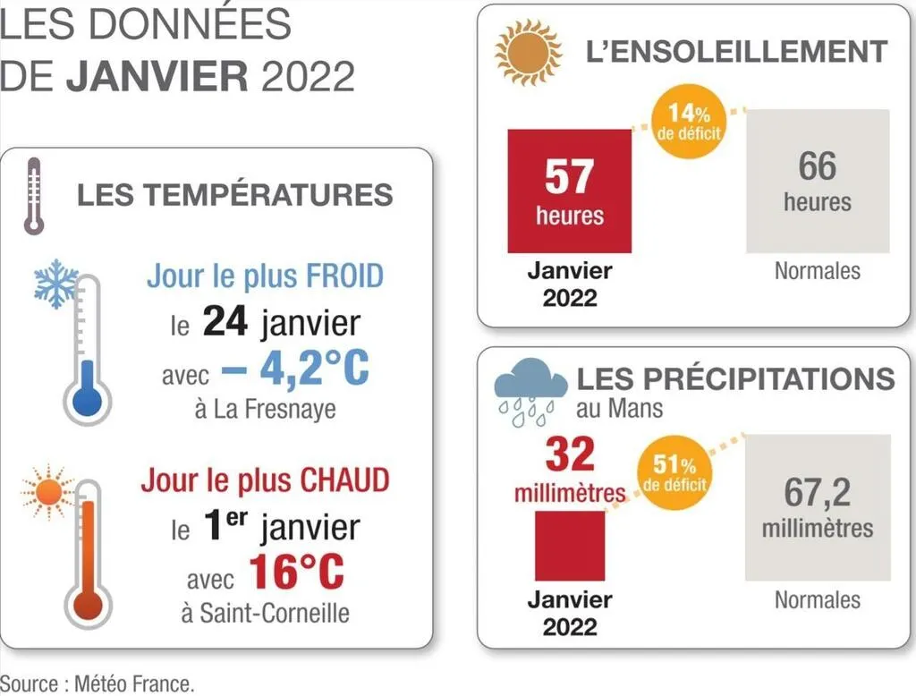 Peu de soleil, pas suffisamment de pluie, du brouillard et des températures conformes aux normales de saison, voici résumée la météo du mois de janvier 2022 en Sarthe.