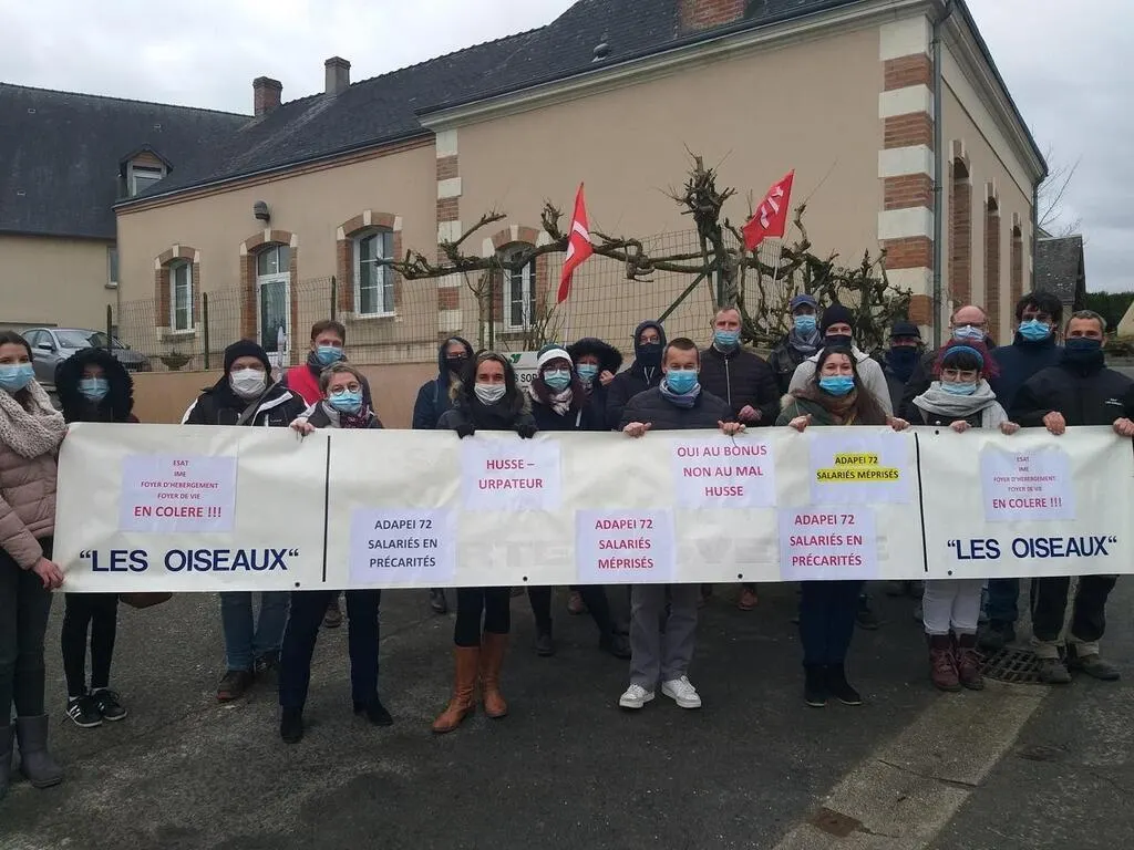 Ce mardi après-midi, des personnels de différentes structures de l’Adapei (Association départementale des amis et parents d’enfants inadaptés) de la Sarthe étaient réunis pour manifester à l’entrée du foyer de vie Les Sorelles à Thoiré-sur-Dinan ; le même type d’expression de mécontentement se déroulait en même temps à l’Esat (Établissement et service d’aide par le travail) et au foyer de Ballon-Saint-Mars.