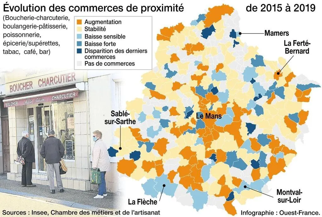 Ces cinq dernières années, une quarantaine de communes, sur les 354 que compte le département de la Sarthe, ont perdu plus de la moitié de leurs commerces de proximité. Parmi elles, 13 ont vu leur dernier magasin tirer définitivement le rideau.