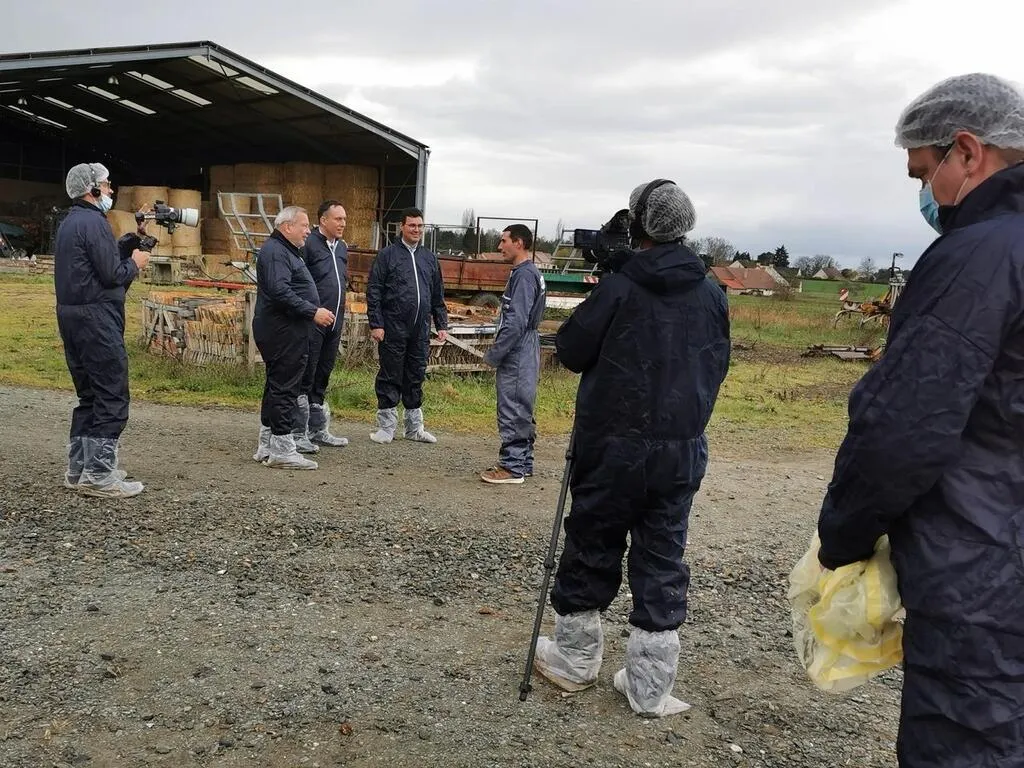 Clap de fin de tournage vendredi aux alentours de 19 h au Gaec de la Lunerotte à Saint-Gervais-en-Belin, géré par Alexandre Bourge, exploitation qui produit les porcs transformés par l’entreprise Cosme. © Le Maine Libre