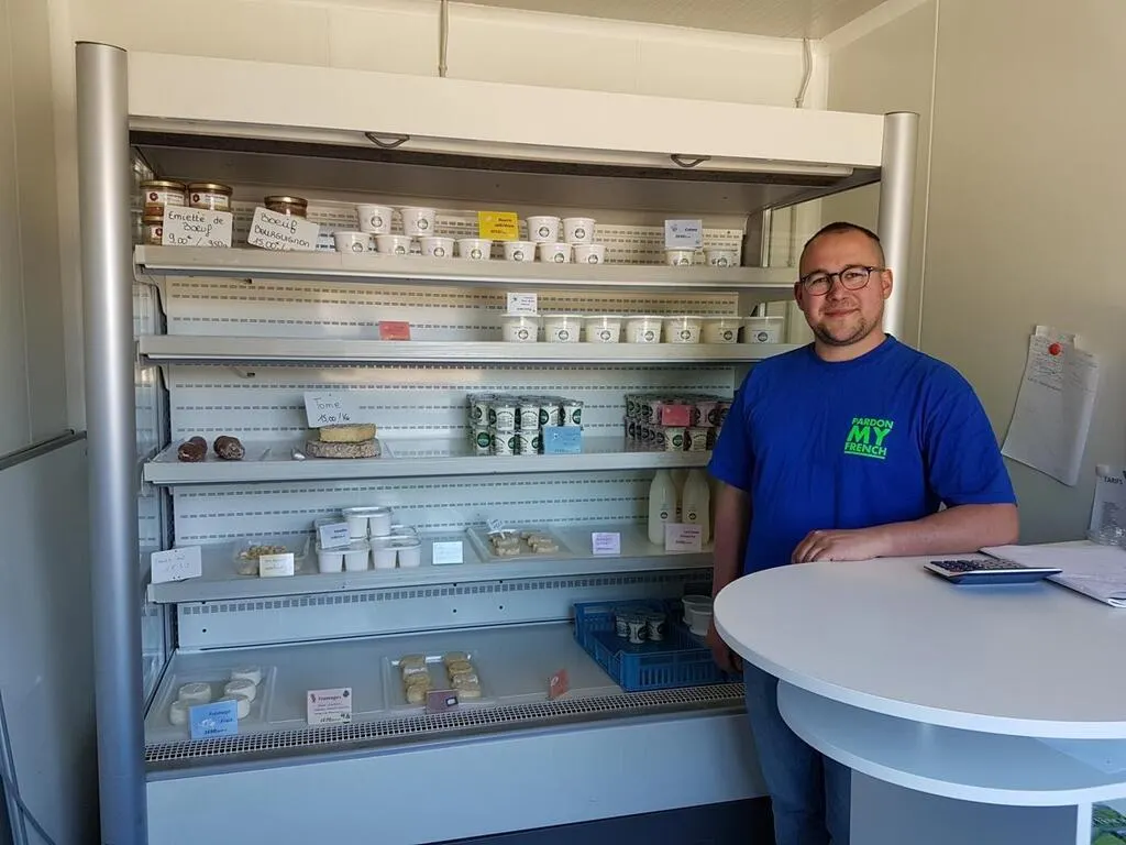 Florian Petit, cogérant de La Ferme de la Ginglinière, vend ses produits laitiers directement à la ferme. © Le Maine Libre
