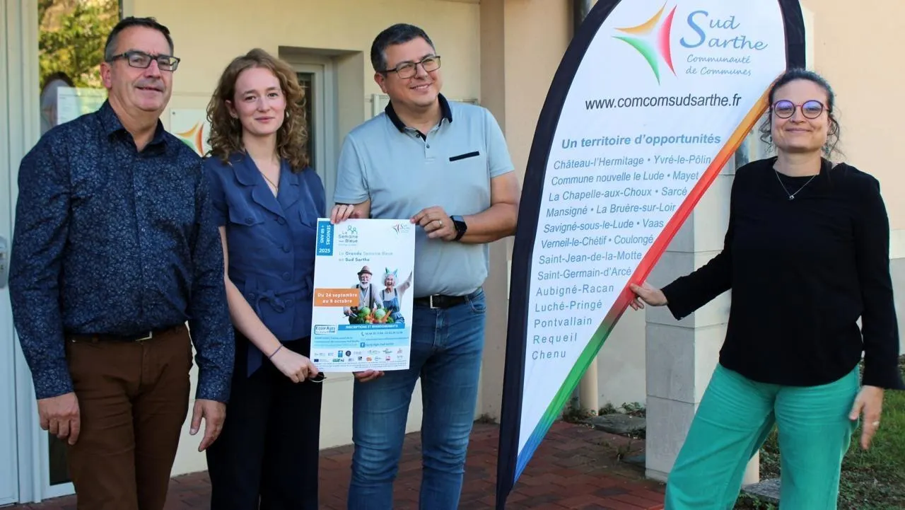 François Boussard, président de la communauté de communes Sud-Sarthe, Lison Bougard, coordinatrice santé, Pierre Ouvrard, vice-président Sud-Sarthe, chargé de la santé, et Marie Canevet, directrice adjointe du centre social Equip’âges, ont présenté la Semaine bleue. © Le Maine Libre