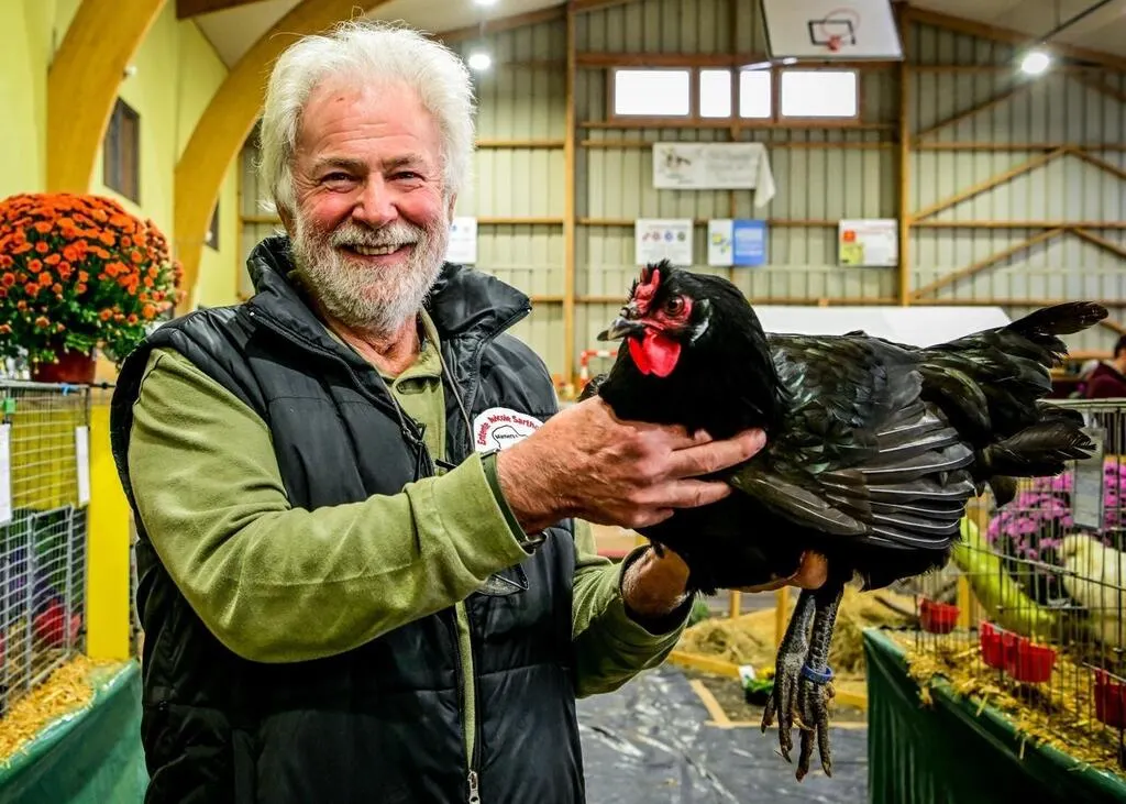 Rouez, samedi 2 novembre 2024. Éleveur amateur, Alain Legaré présentait ses volailles, notamment cette poule La Flèche, au Salon de la basse-cour. © Le Maine Libre - Yvon LOUÉ