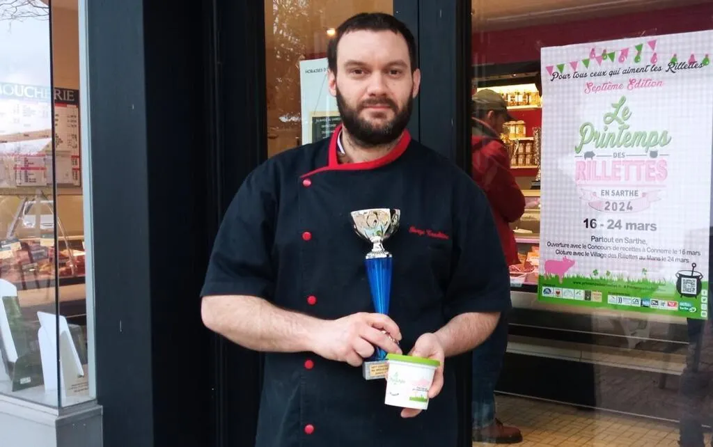 Dans la boucherie charcuterie Sargé tradition à Sargé-lès-Le Mans, le trophée remporté par Damien Ragot lors de la 56e édition du concours national des rillettes sarthoises de Mamers a trouvé sa place.