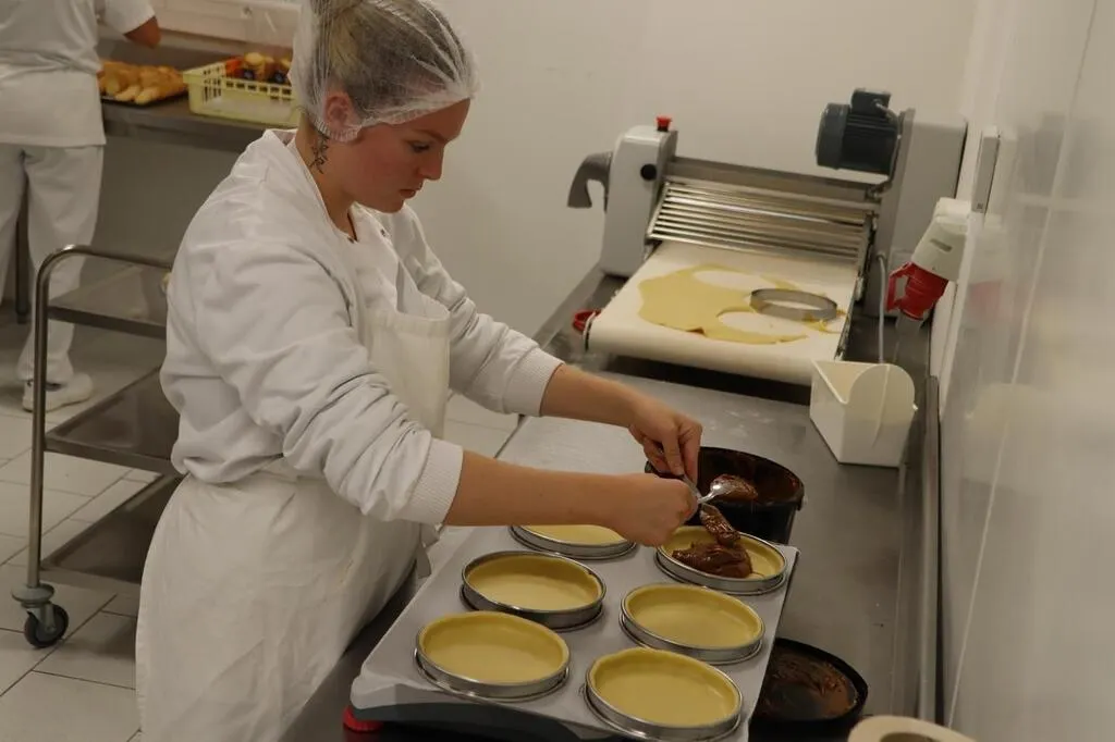 Maéva, l’une des employées, réalise l’étape du fourrage au praliné du Manceau, le nouveau gâteau lancé par Maison Drans. © Ouest-France
