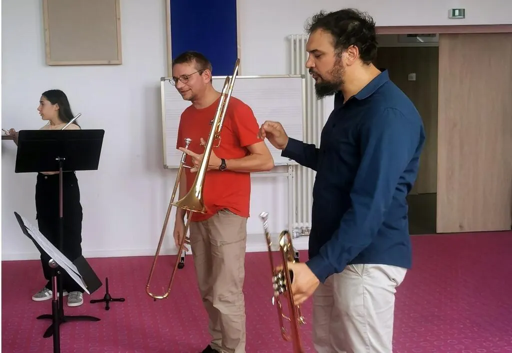 Les ateliers menés par Thomas Gruselle (trombone) et Charly Jacquet (trompette), permettent aux élèves de se rendre compte qu’il n’est pas nécessaire d’avoir un grand niveau pour jouer tous ensemble »,