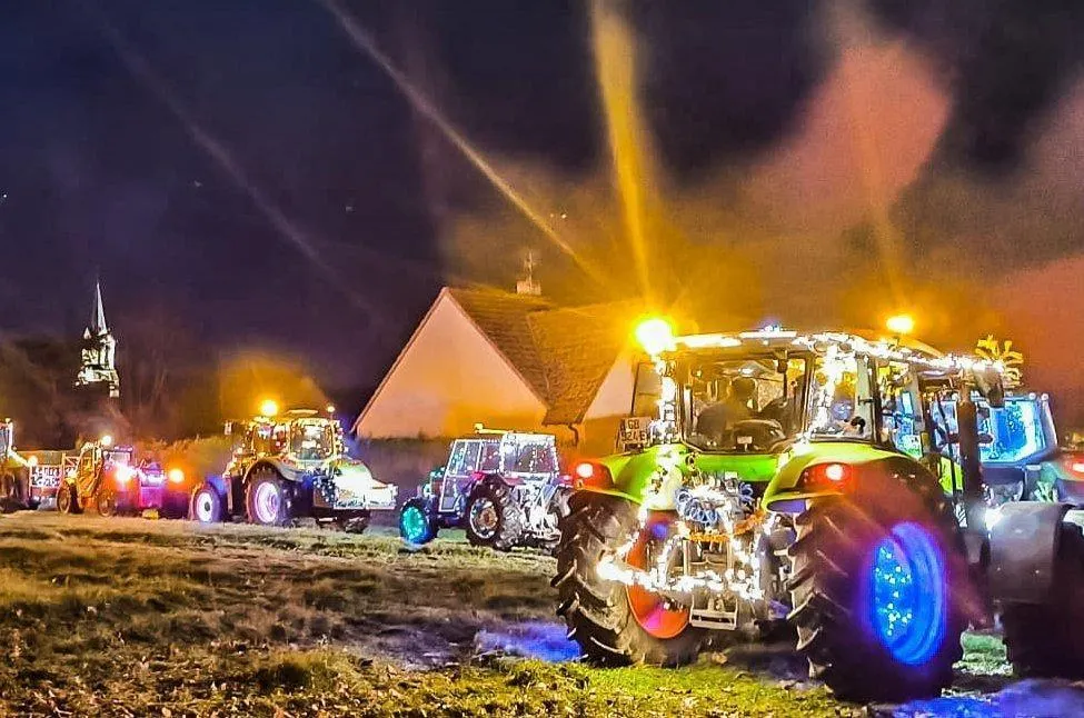 Un sapin d’une dizaine de mètres de haut a été illuminé à la sortie de l’école avant l’arrivée d’un cortège d’une quinzaine de tracteurs décorés pour l’occasion. Cette initiative a été rendue possible grâce à la contribution des agriculteurs de la commune, des jeunes agriculteurs du canton de Montfort-le-Gesnois et des cantons voisins