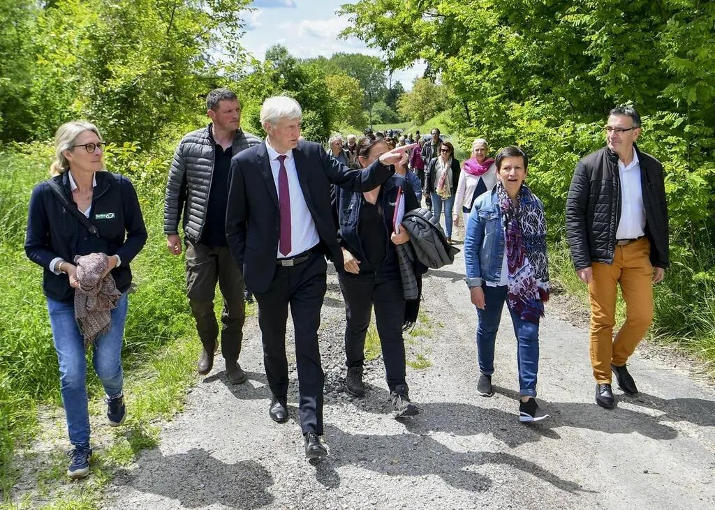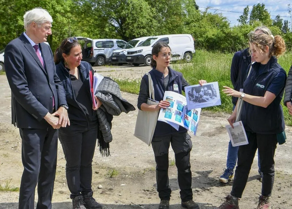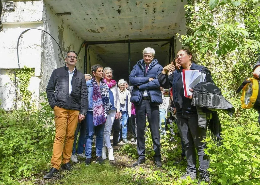 Luché-Pringé, mardi 16 mai 2023. Au centre Dominique Le Mèner, président du Conseil départemental, ici devant l’entrée des galeries où hiberne une importante colonie de chauves-souris. © Le Maine Libre – Yvon LOUÉ