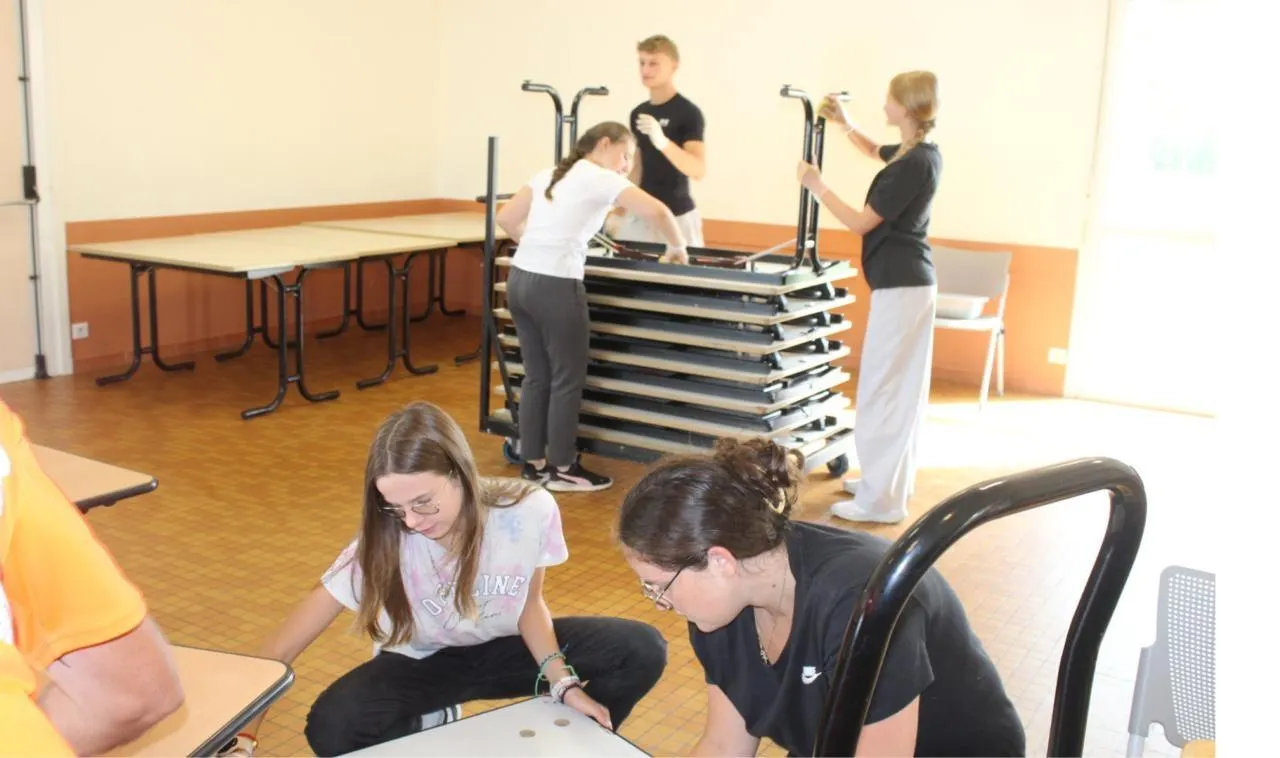 Révision et nettoyage des tables destinées aux associations par Rose, Amandine, au premier plan et Louane, Léo et Justine. © Le Maine Libre