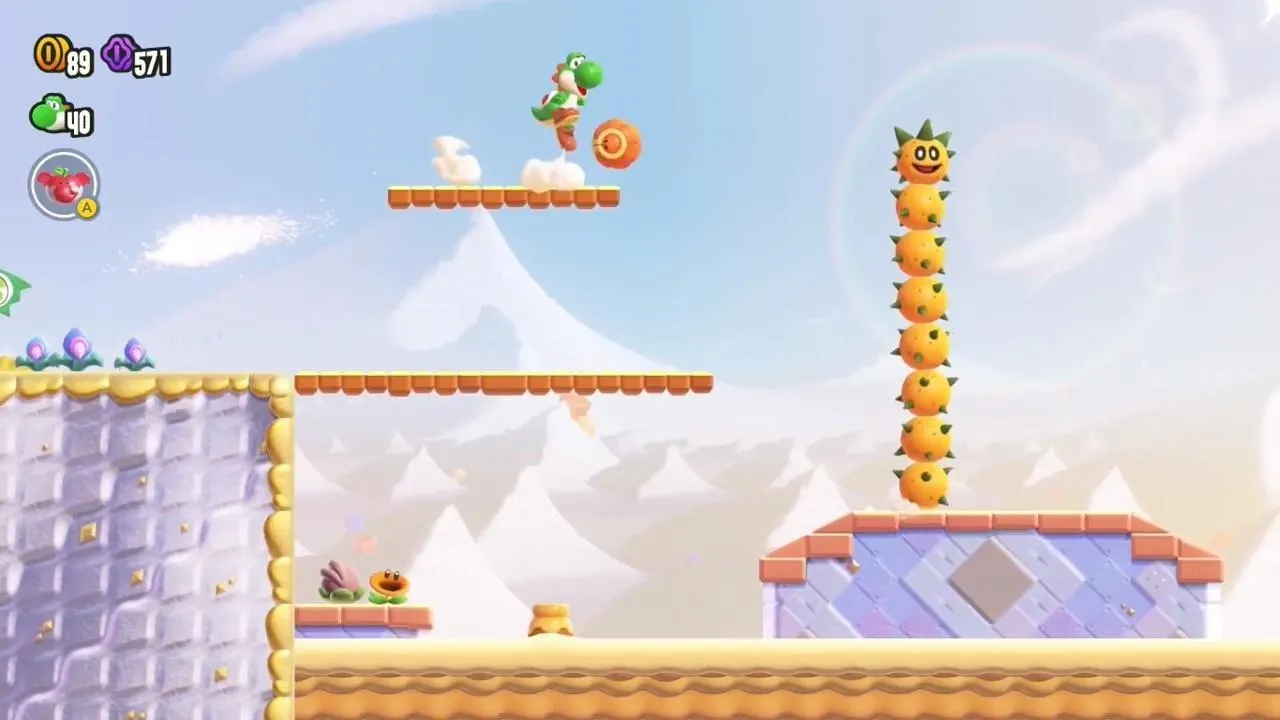 Le Désert cuisant de Super Mario Bros. Wonder mêle nouveaux ennemis, comme les Tatoumis, et anciens adversaires, comme les célèbres Pokeys. © Nintendo