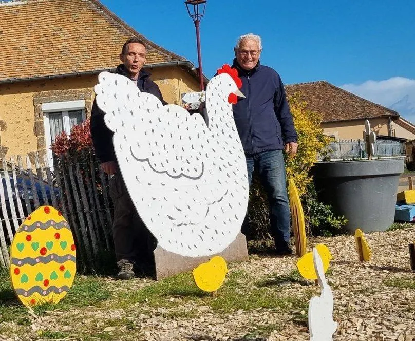 À moins de quinze jours du week-end de Pâques, une équipe de bénévoles s’active sur le rond-point du cœur de bourg autour de la cabane en bois qui deviendra, sous peu, un poulailler.
