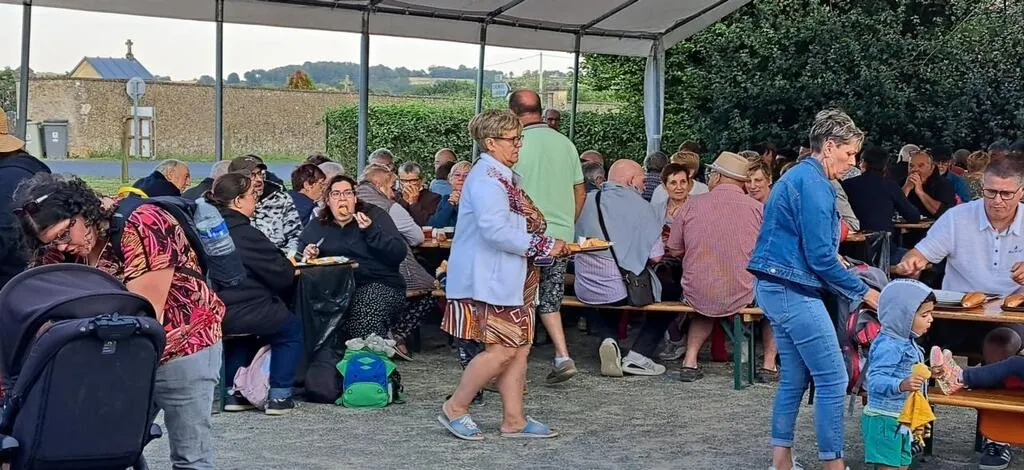 Samedi, alors que les artificiers préparaient le feu d’artifice, environ 200 personnes attendaient le spectacle autour d’un repas. Dans la salle, quelques enfants profitaient de l’espace pour danser. « On décale toujours la cérémonie », explique le maire Luc Bourmault. © Ouest-France