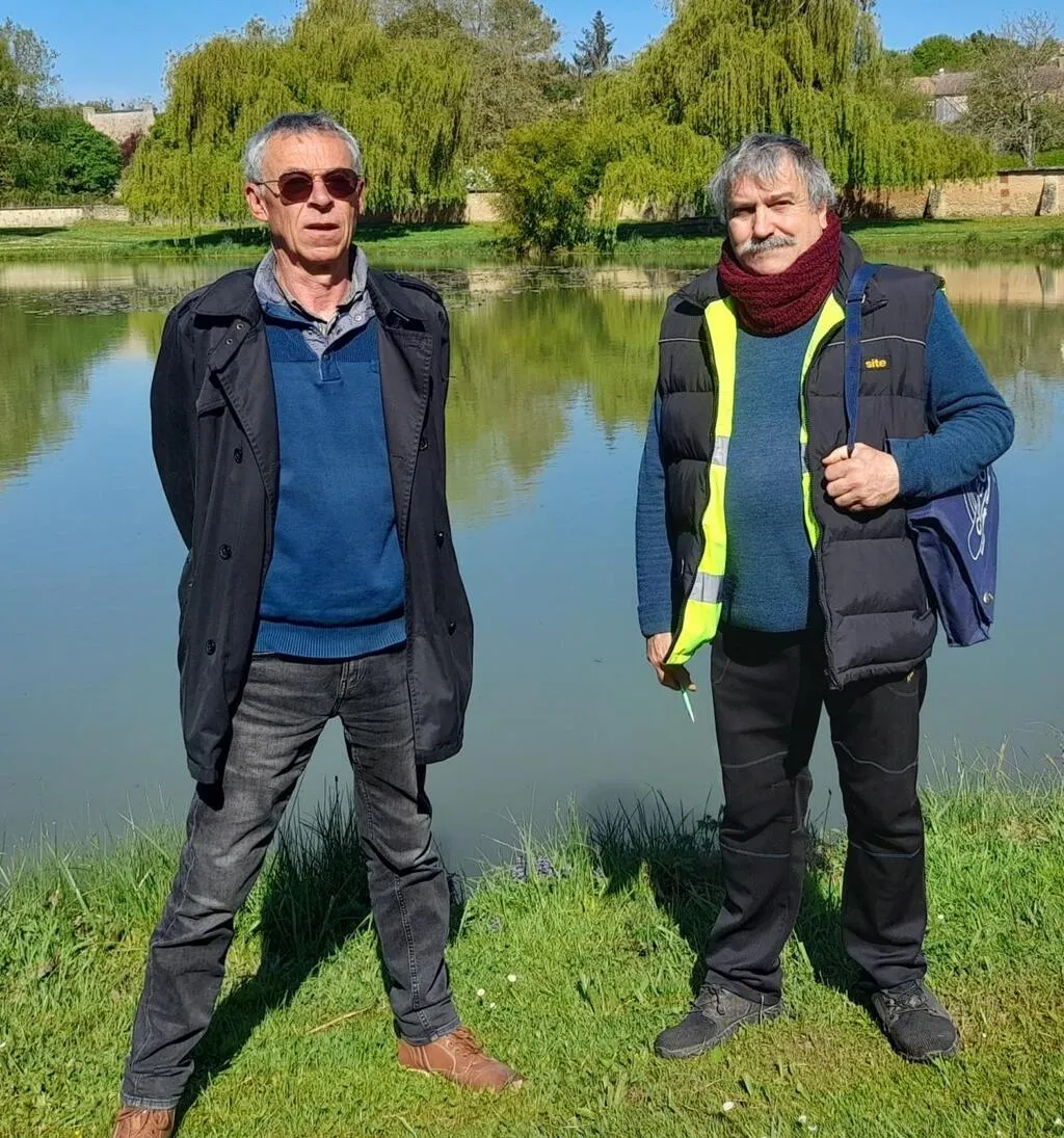 Laurent Moussion (à gauche) et Armand Macé devant l’étang de Souligné qui accueillera le lâcher de truites. © Le Maine Libre