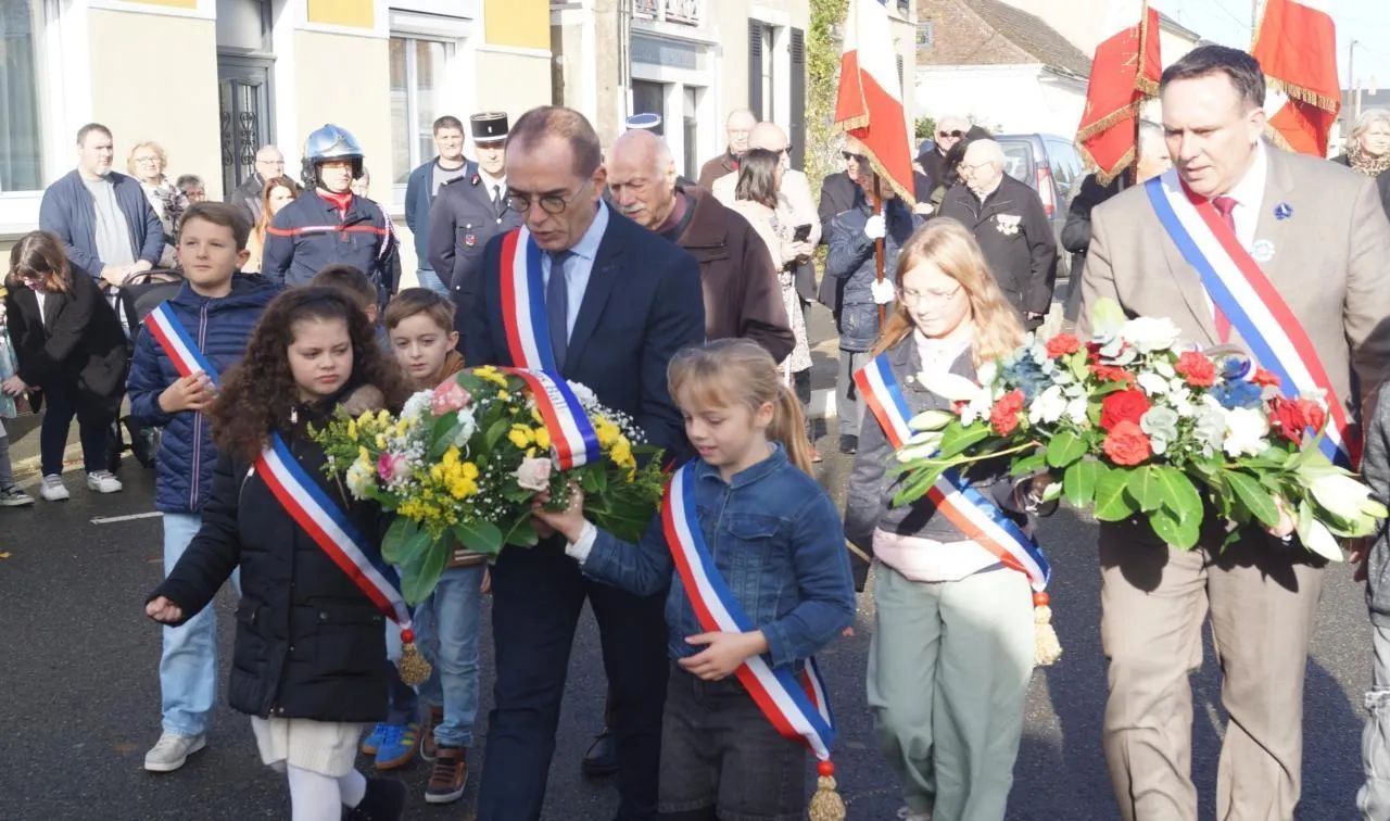 Pour la cérémonie du 11 Novembre, les nouveaux élus du conseil municipal enfant ont déposé avec fierté des gerbes de fleurs, accompagnés de David Chollet, maire, et de Thierry Cozic, sénateur de la Sarthe. Une cérémonie qui restera gravée dans la mémoire des jeunes élus. © Ouest-France
