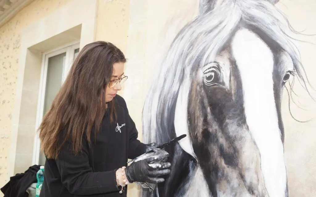 Manon a fini de peindre une impressionnante tête de cheval sur la maison de son oncle qui est visible depuis la rue principale.