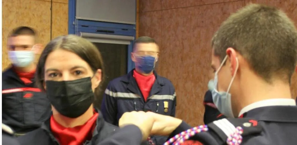 Le caporal Jessica Plaquet reçoit la fourragère des mains du capitaine Florent Rey, représentant le SDIS Le Mans. © Le Maine Libre