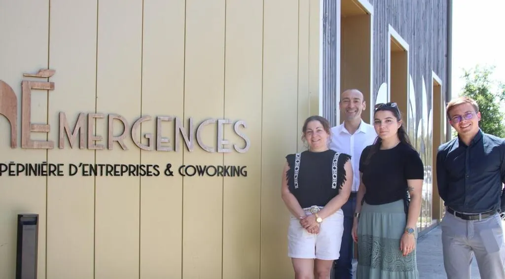 Simon André (au 2nd plan) a accueilli les créateurs de WakUp Intérim à Emergences, pépinière d’entreprises et espace de coworking. © Communauté de communes Val de Sarthe.