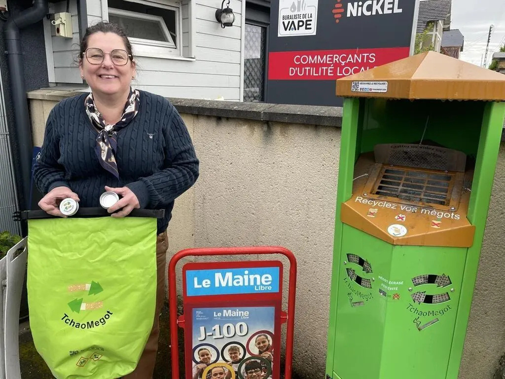 Devant le tabac du Maine, Laurence Proust bénéficie d’un cendrier de collecte, dans lequel elle met les mégots laissés par les clients à l’entrée du magasin. © Le Maine Libre