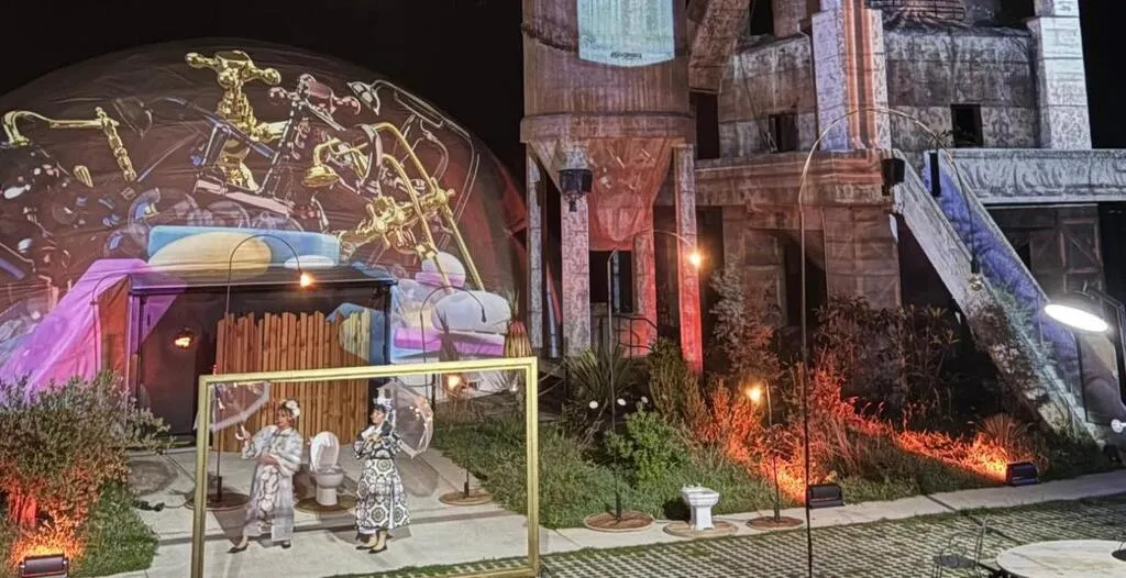 Une fois de plus, c’est une histoire burlesque autour d’un évier, d’un WC et d’un lavabo, qui attend le public au cœur d’un théâtre de plein air : deux femmes se rencontrent dans une salle de bains par le plus grand des hasards. Une baignoire remplie d’eau et quelques brosses à dents égarées dans un gobelet en plastique. Un sèche-serviette électrique blanc étincelant réchauffe une serviette encore humide ou encore une huile « douceur estivale » posée sur une étagère en verre très poli. Il ne faut jamais rentrer dans une salle de bains sans son parapluie… C’est là que l’aventure commence.