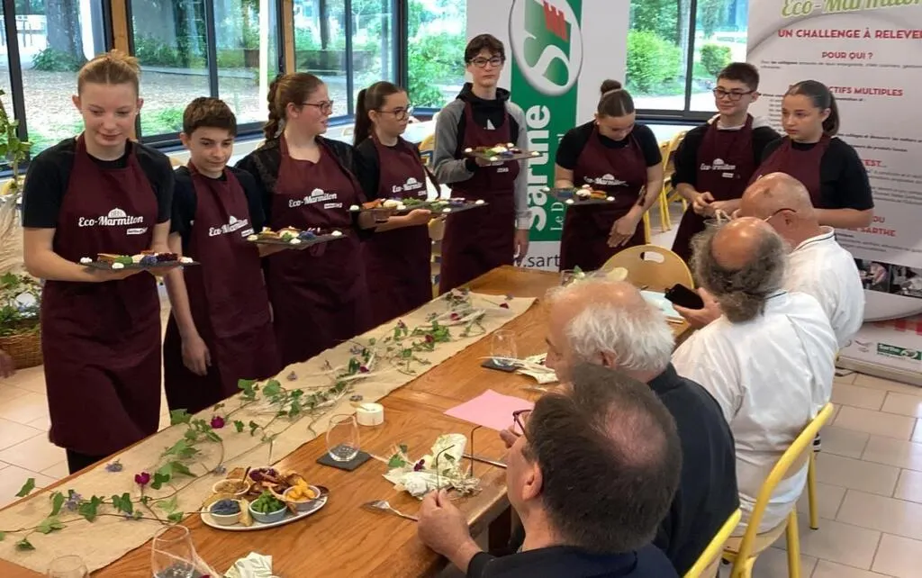 Dans le cadre du défi éco-marmiton, les élèves du collège Saint-Jean-Baptiste-de-la-Salle de Teloché ont présenté mercredi la version gastronomique de leur précédente recette simplifiée : « l’étoile des sens » composée de différentes purées de légumes et salades avec, au centre, un œuf poché (lire « Le Maine Libre » du 20 avril).