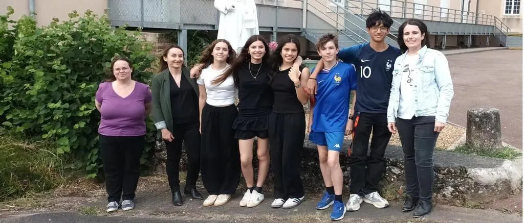 Professeurs et collégiens, avec de gauche à droite : Ronsse Damaris, Stéphanie Taranne, Lisa (F), Isabel (P), Gabrielle (F), Léna (F), Eduardo (P) et Fontan Maquiera. © Ouest-France