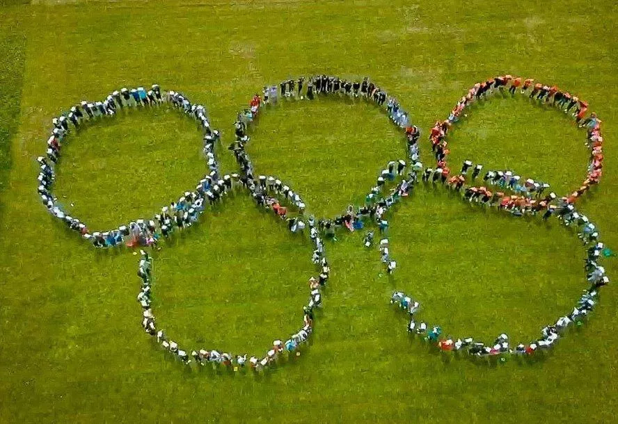 Tous les élèves participants aux olympiades reproduisant les anneaux des JO. © Stéphanie Couret