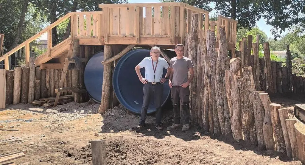 Quand il pleuvra, les écoliers s’abriteront sous une immense pergola de plus de 30 mètres, avec cabane en bois et tipi tressé. « En ce qui concerne les vertus pédagogiques et écologiques de ces installations, on y entretiendra un potager et un bassin de pluie filtrant, explique le maire, Gérard Lambert, au moment de visiter le chantier. Ce dernier est destiné à déconnecter du réseau l’eau reçue des gouttières provenant du plus grand bâtiment. »
