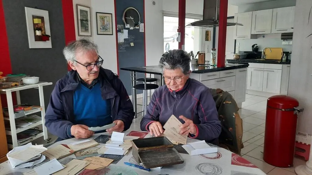 Séquence émotion : dans une boîte en fer au fond du grenier, Odile Verrière a retrouvé la correspondance de son père, prisonnier en Allemagne. Avec André Jaunay, ils choisissent quelques lettres pour l’exposition. © Ouest-France