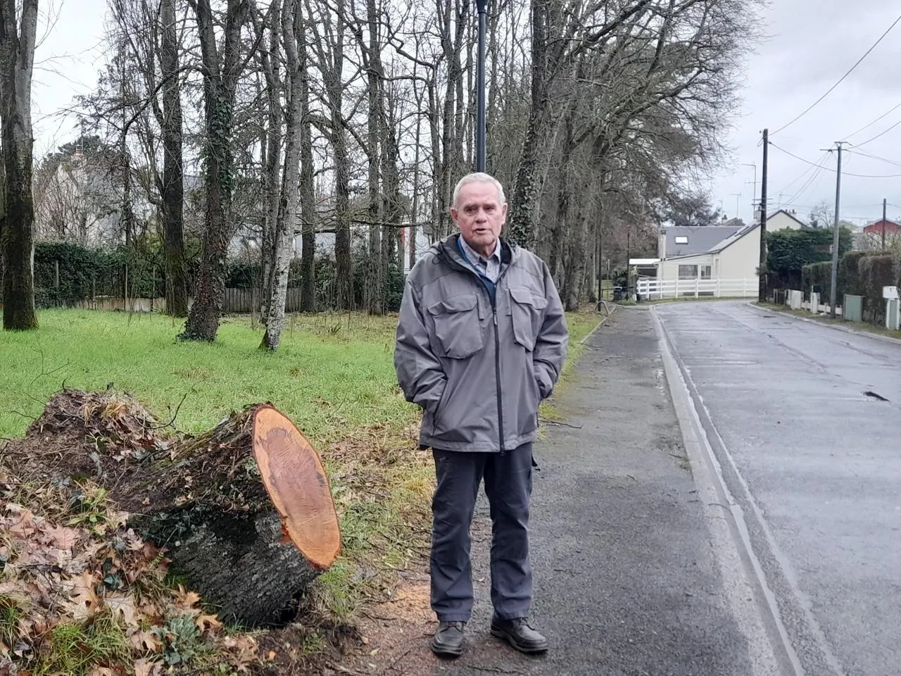 photo  gilles bodinier devant la souche de l’arbre qui s’est abattu dans sa rue.  ©  ouest-france 1