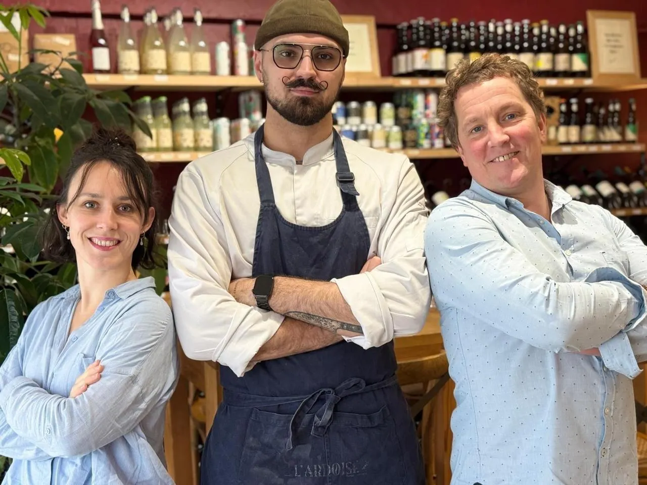 De gauche à droite : Mathilde, responsable de la communication et du service, Louis, chef de cuisine, et Nicolas Lachèvre, à la tête du restaurant L’Ardoise, situé à Brissac-Quincé (Maine-et-Loire). © L’Ardoise Brissac-Quincé