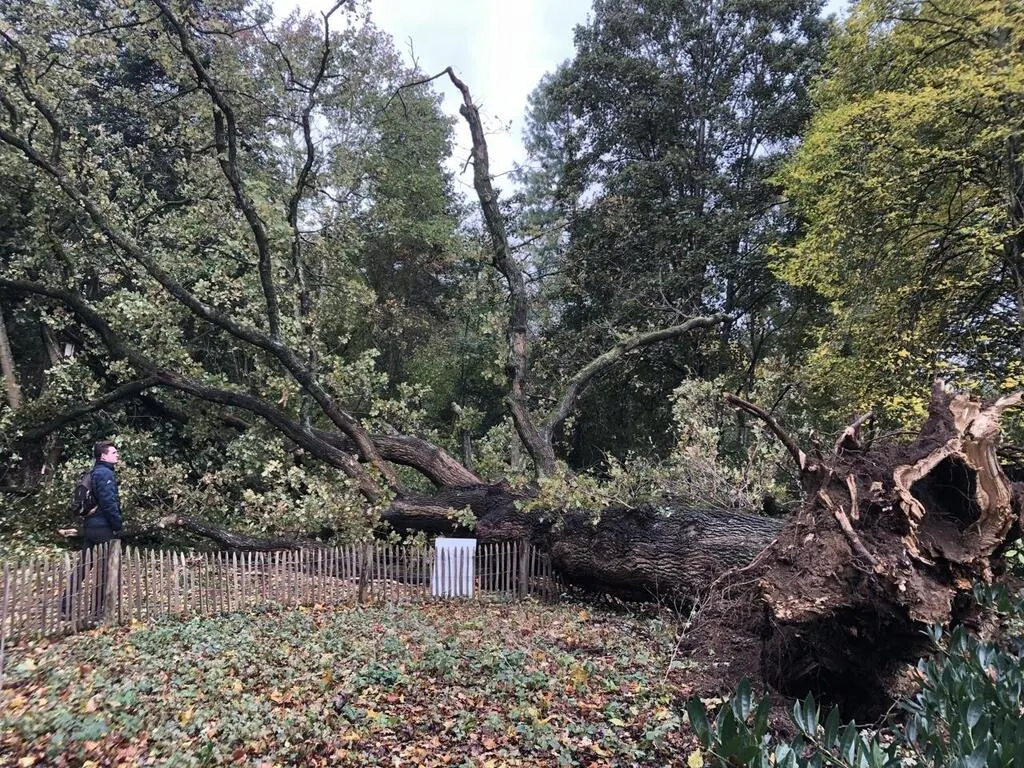 Un des arbres remarquables du parc Banjan, un chêne plus que centenaire, a été couché par la tempête Ciaran, au Mans (Sarthe). Le fracas de sa chute a été entendu par les riverains, au petit matin.