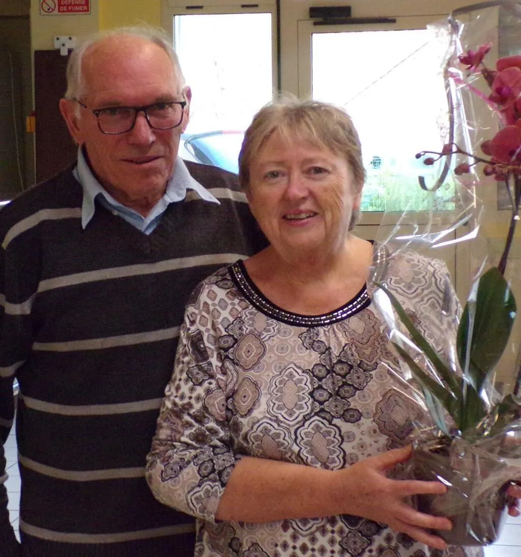 Le président Claude Salé a offert des fleurs à Nadine pour la remercier du bénévolat assuré au sein du club. © Le Maine Libre