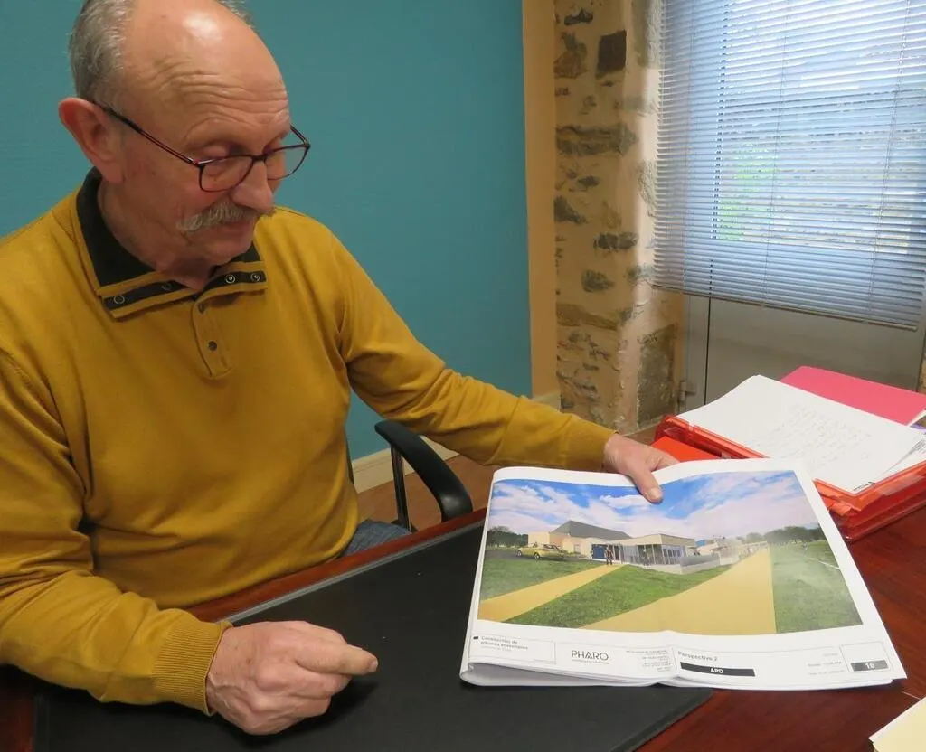 Jacky Marchand, maire de Trangé, présente le plan établi par la société d’architectes Pharo pour réaliser les tribunes et vestiaires au nouveau terrain de football. © Le Maine Libre
