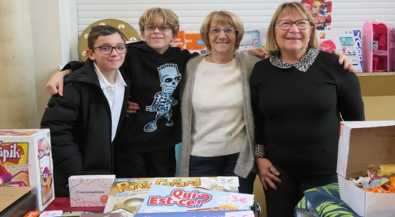De gauche à droite : Sacha, Ewann, Martine et Odile, les mamies venues avec leurs petits enfants vendre les jouets ce 23 novembre à la bourse aux jouets et livres de l’association Trangé Bougez. © Le Maine Libre