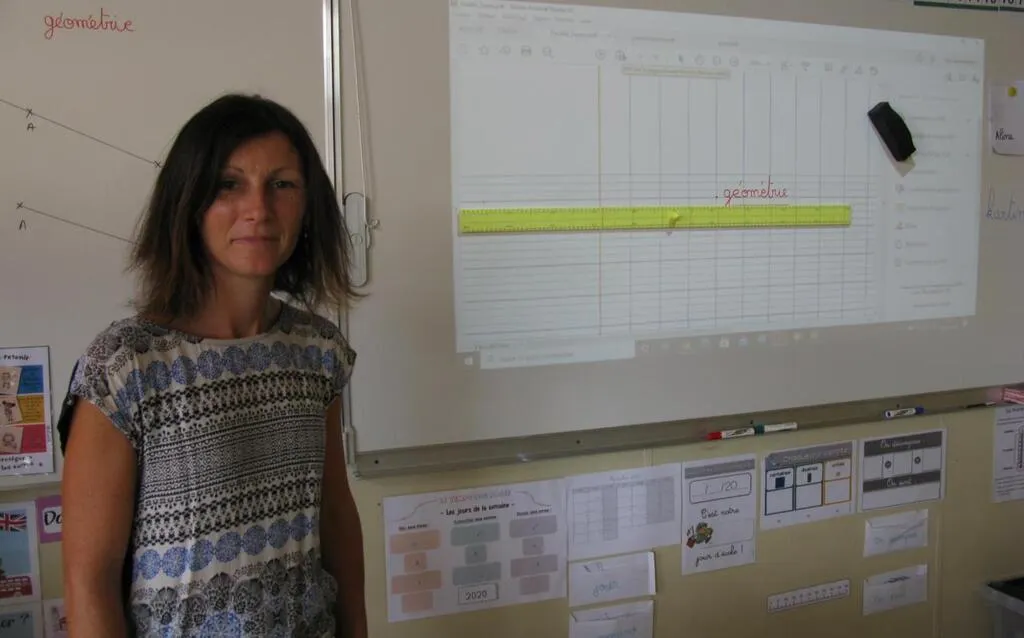 Aline Duval dans sa classe équipée d’un tableau numérique. © Ouest-France