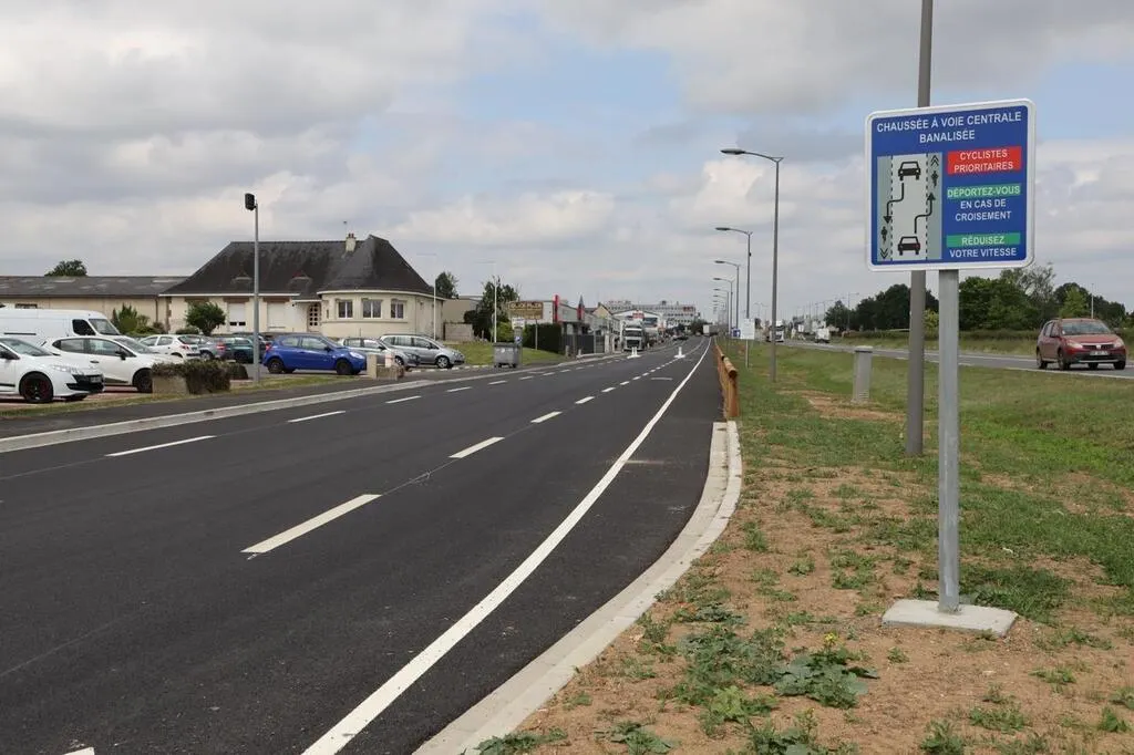 La rue Saint-Laurent, refaite, fonctionne désormais avec le principe du chaussidou : une chaussée à voie centrale banalisée. © Ouest-France