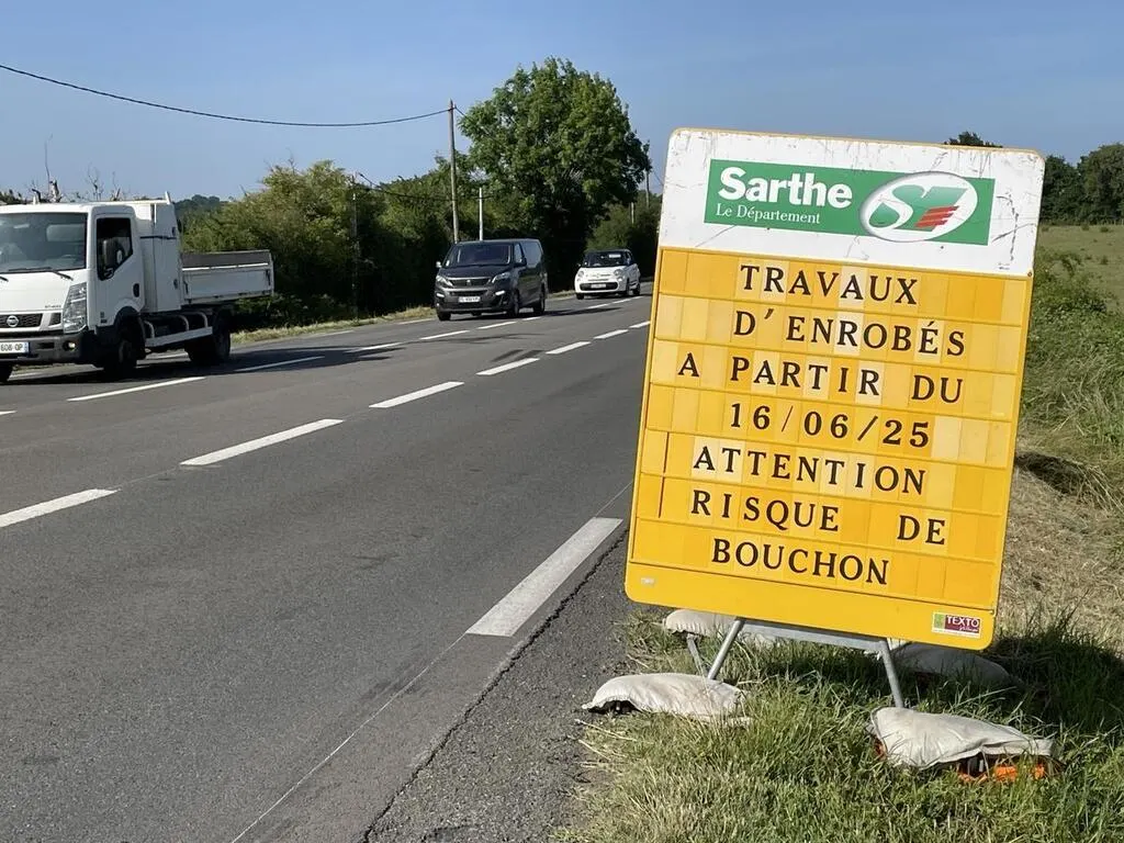 Des panneaux préviennent des risques de ralentissement sur la RD323. © Le Maine Libre