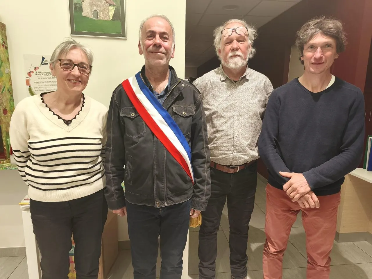 Le maire Georges Pavard, accompagné de ses adjoints Claudine Marais à gauche, Jean Hirschler et Sébastien Vallée à droite. Absente sur la photo : Nicole Sidoli. © Le Maine Libre