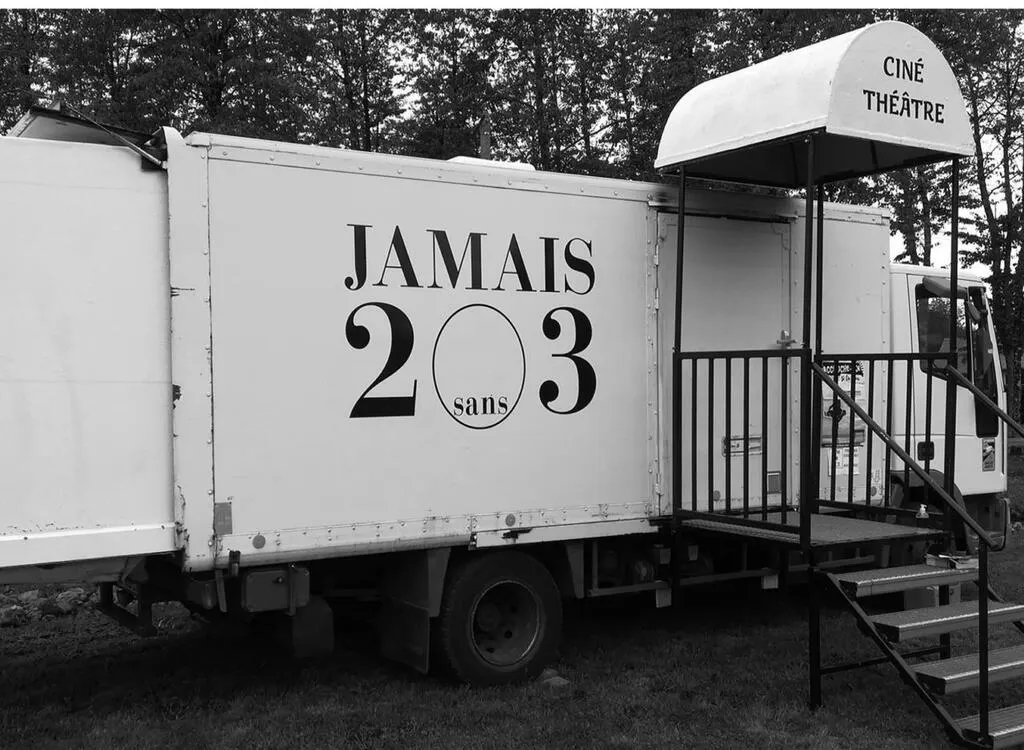 Denis est artiste associé de la compagnie Jamais 203 qui est donc propriétaire du camion.  Nous l’avons aménagé en salle de spectacle avec une extension pouvant accueillir jusqu’à trente personnes.Â