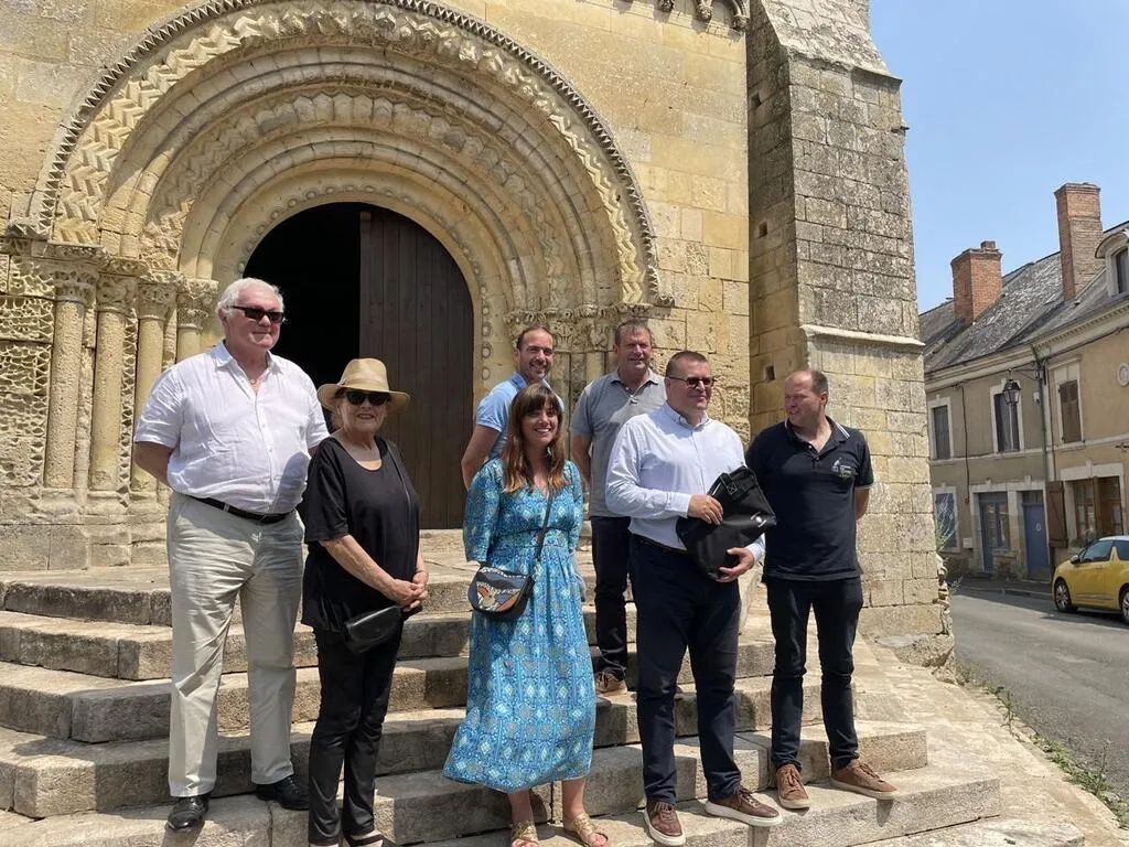 À côté de lui, Fanny Boulfray (peintures et décoration à La Flèche) ou encore Guillaume Bourneuf, menuisier à Parigné-l’Évêque, écoutent la présentation de l’église de Bazouges, dont la restauration de la toiture et de la charpente devrait débuter en 2024.