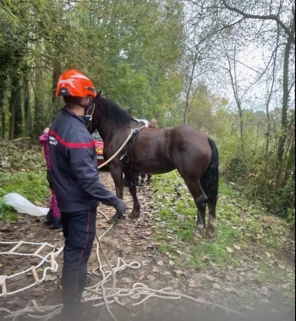 Un cheval et son attelage sont tombés dans la Mayenne. Les pompiers ont pu sortir le cheval de l’eau, en utilisant des cordes. © Ouest-France