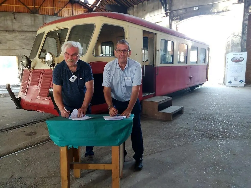 Bruno Duru et Jean-Paul Lescat signent la convention de mise à disposition de l’autorail. © Le Maine Libre